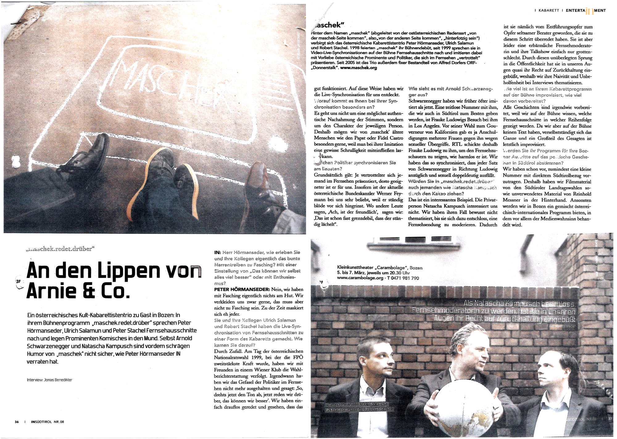 Ein österreichisches Kult-Kabarettisten-Trio zu Gast in Bozen: In ihrem Bühnenprogramm „maschek.redet.drüber“ sprechen Peter Hörmanseder, Ulrich Salamun und Peter Stachel Fernsehausschnitte nach und legen Prominenten Komisches in den Mund. Selbst Arnold Schwarzenegger und Natascha Kampusch sind vor dem scharfen Humor der „maschek“-nicht sicher, wie Peter Hörmanseder IN verraten hat.