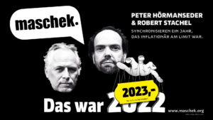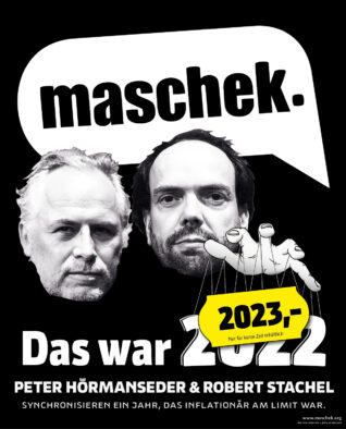 Peter Hörmanseder und Robert Stachel synchronisieren ein Jahr, das inflationär am Limit war. Das Maschek-Jahr 2023. Projiziert. Synchronisiert. Improvisiert.